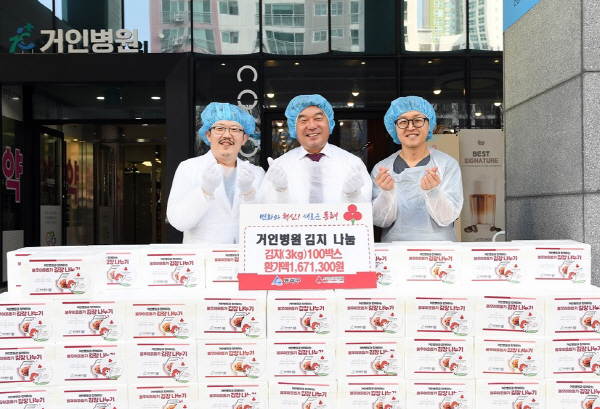 동래구 사직동에 위치한 거인병원은 매년 11월 말 김장김치 나눔 행사를 이어오고 있으며, 임직원들이 직접 배추를 선별부터 절임, 양념, 포장까지 담당하고 있다.